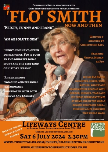 We are delighted to present "Flo' Smith Now and Then" in the Lifeways garden on 6th July at 2:30pm. Written and Directed by Christopher Saul and starring Ursula Mohan as Flo, this solo female performance describes the life of Christopher's grandmother as she looks back over her life enduring two world wars.
